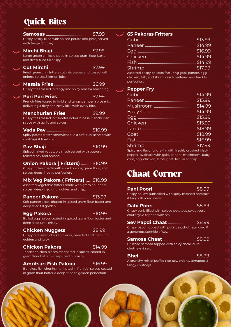 65 Pakoras Fritters Gobi, Paneer, Egg, Chicken, Fish, Shrimp