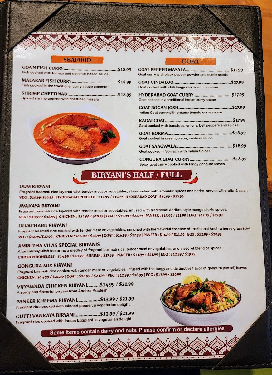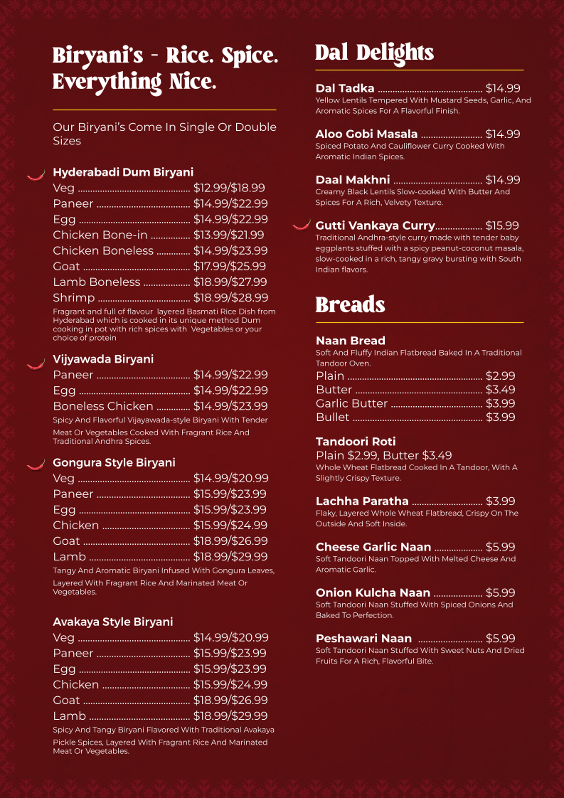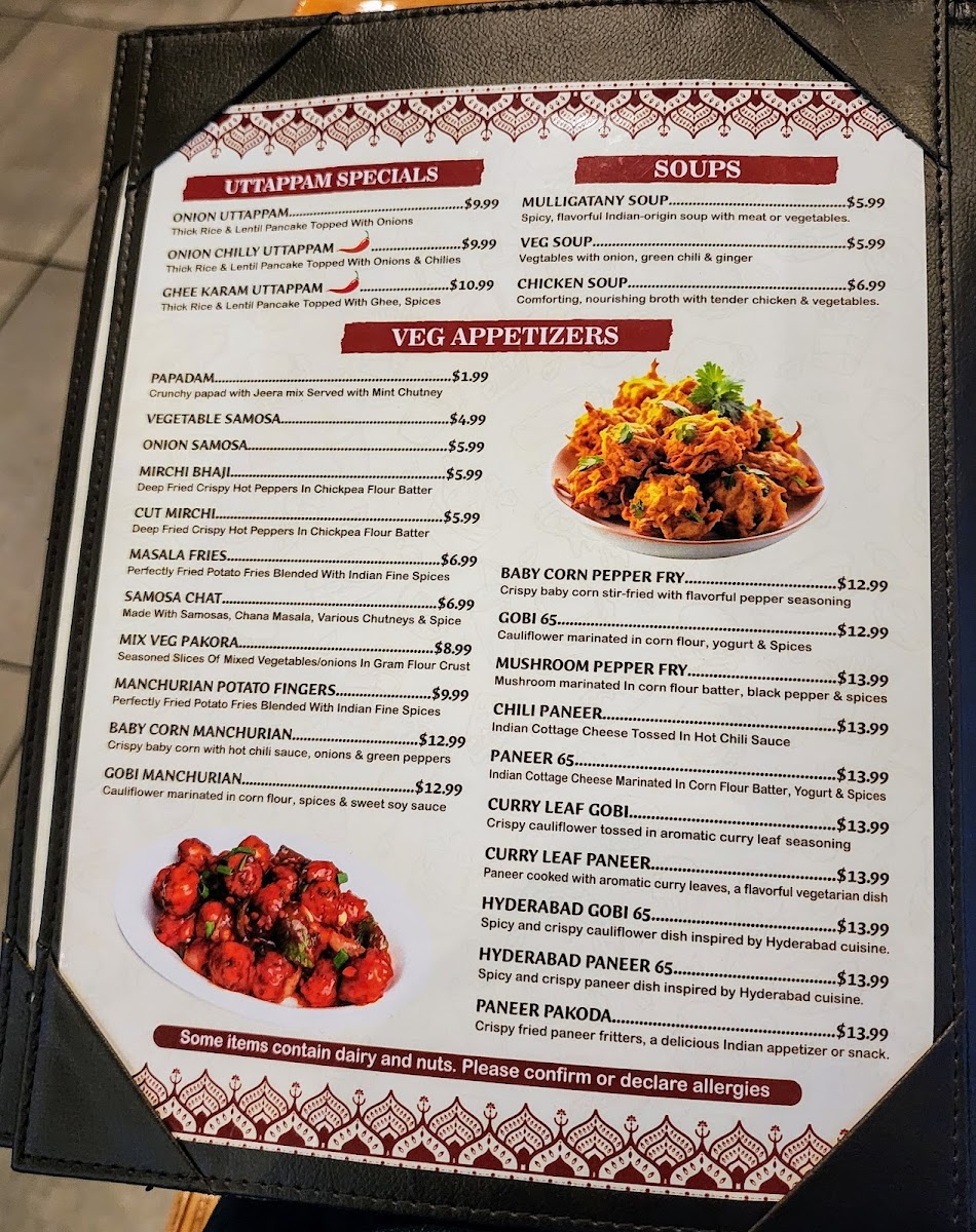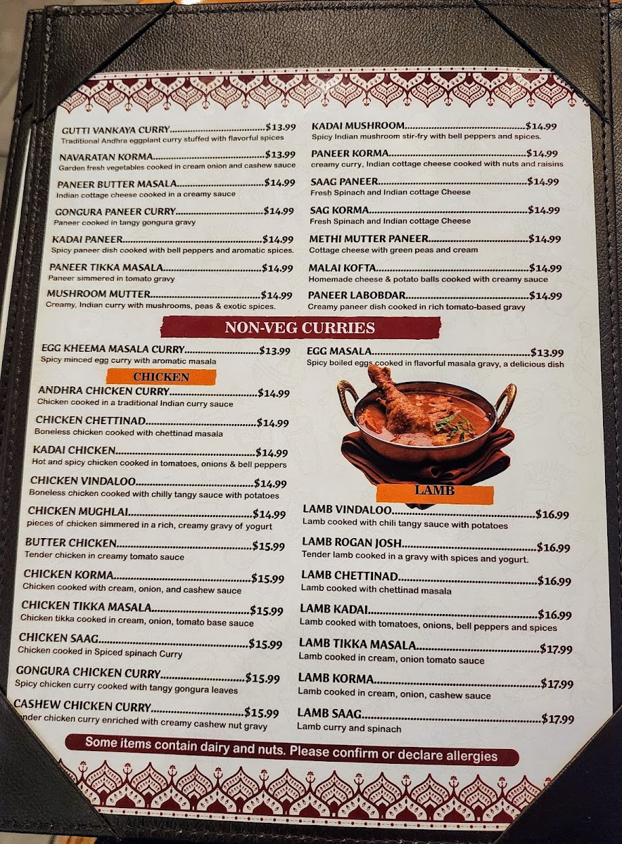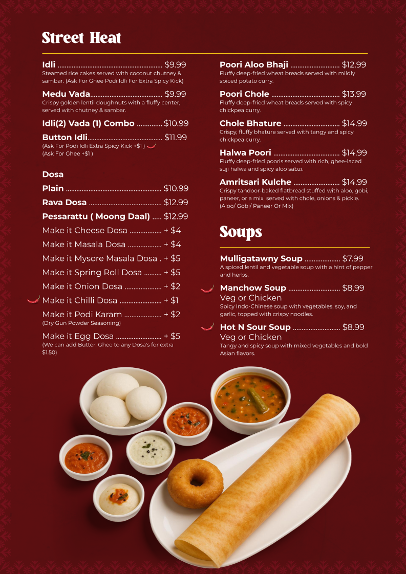 Fiery and aromatic Chettinad curry with mix veg, paneer, egg, chicken, goat, lamb, or shrimp cooked in traditional Tamil Nadu spices.